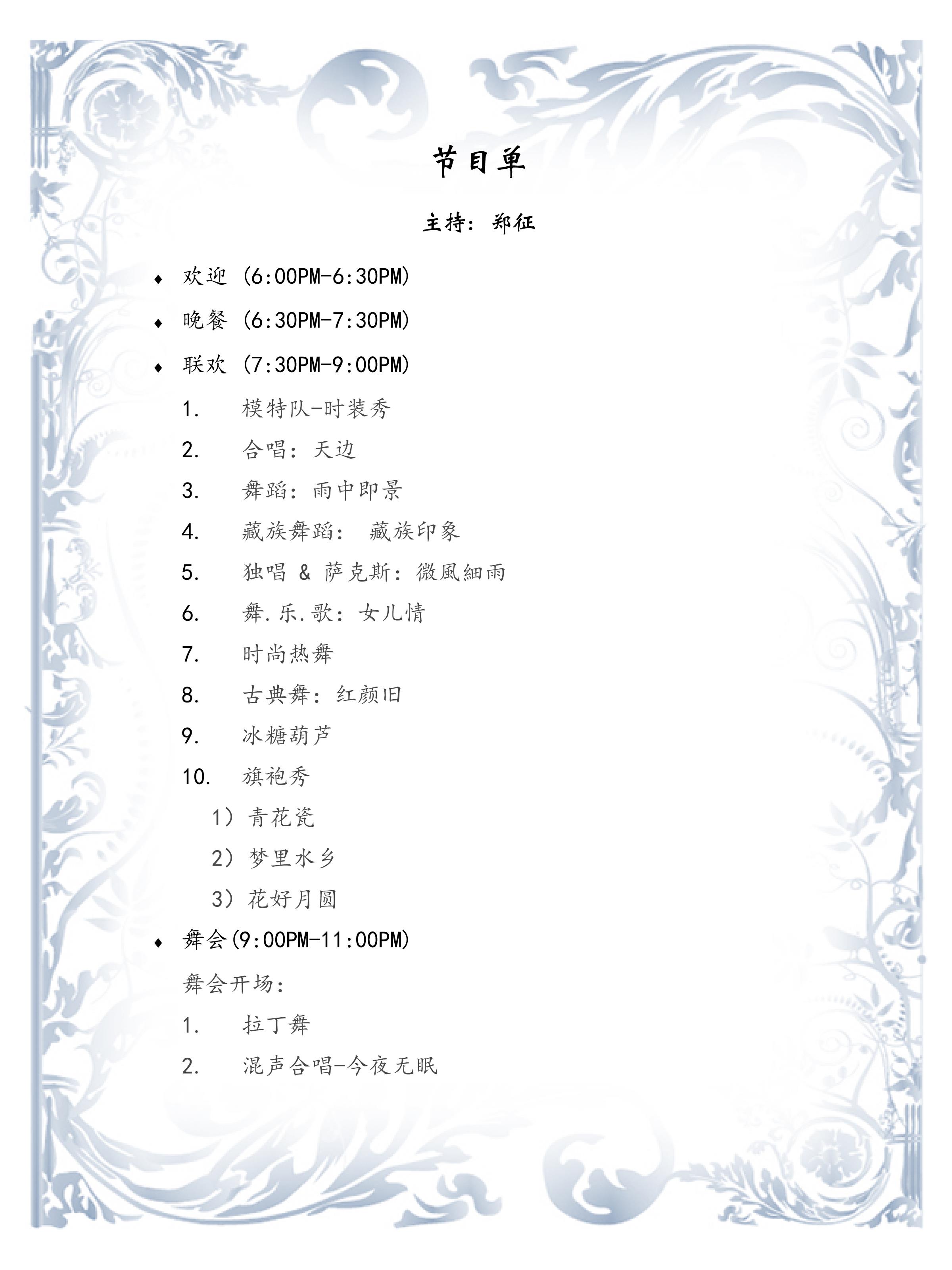 8月底开始和管理团队讨论商定今年年会的计划;9月中旬开始联系场地;十一国庆升旗仪式活动后正式开始组织报名;300人的场地,到10月底已经差不多都报满了;11月各组都在进行最后的紧张的排练,售票,征集广告,设计打印节目单,编辑音乐,各项准备工作都在紧张的进行着;12月初,嘉宾和媒体名单敲定,管理人员的具体分工也已确定;只等待12月10日晚的那一刻。